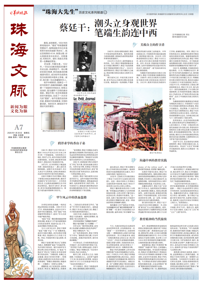 今日珠海,先贤的教育理想正在续写新篇。中共珠海市委宣传部、羊城晚报报业集团联合主办,珠海高新技术产业开发区、珠海市社会科学界联合会协办的“教泽绵长 桃李芬芳——珠海大先生”历史文化采访活动已启动,系列报道正陆续推出。“珠海大先生”系列报道将循着历史足迹,致敬先贤风骨,在现实与历史的交汇中传承精神力量,弦歌不辍,薪火相传。