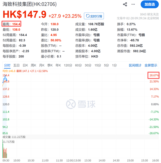 2月20日上午,港股AI应用板块延续节前涨势。海致科技集团盘初一度涨超28%,最高价达154.4港元/股,续创上市以来新高。