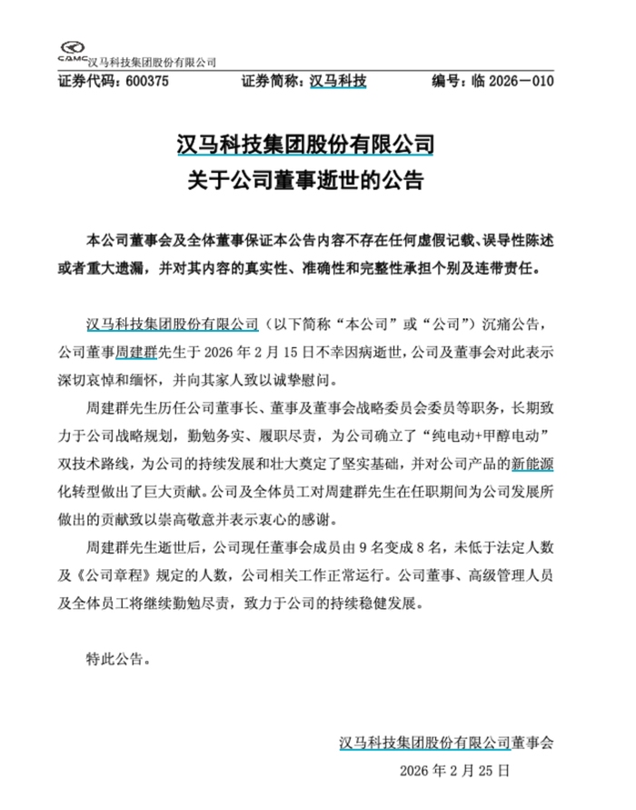 2月24日,汉马科技发布公告称,公司董事周建群于2026年2月15日不幸因病逝世。